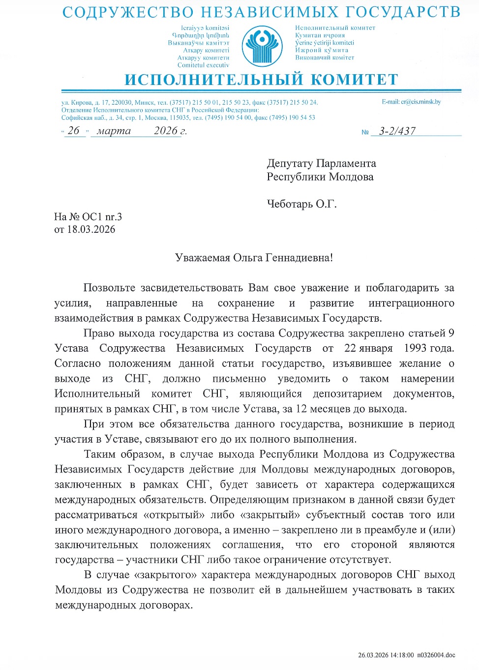 Olga Cebotari a anunțat că, pe 18 martie, a trimis o solicitare oficială Secretarului General al CSI pentru clarificări privind procedura de ieșire și participarea ulterioară a Moldovei în peste 200 de acorduri internaționale semnate în cadrul CSI.