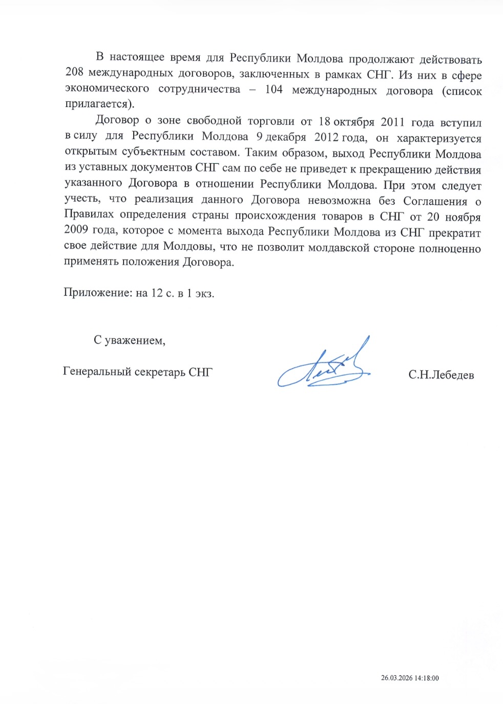 În răspunsul său, Secretarul General al CSI a comunicat: „Un stat care intenționează să părăsească organizația trebuie să notifice oficial cu 12 luni înainte. Aceasta înseamnă că după transmiterea notificării, Republica Moldova va rămâne membră a CSI încă un an.”