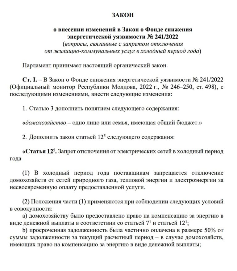 ПСРМ потребовала запретить отключение домохозяйств от энергосетей в холодное время года понедельник декабря 8th, 2025 Депутат от фракции ПСРМ Владимир Односталко зарегистрировал в парламенте проект поправок в Закон о фонде снижения энергетической уязвимости. Автор проекта отмечает, что Молдова с 2022